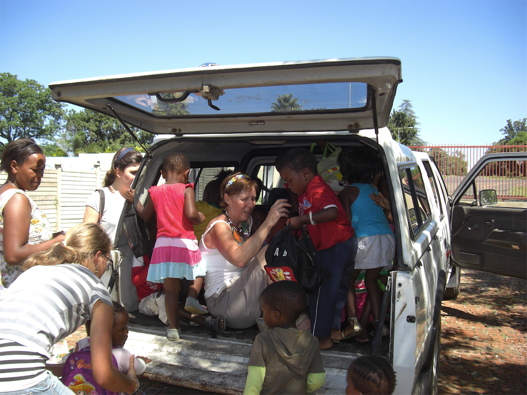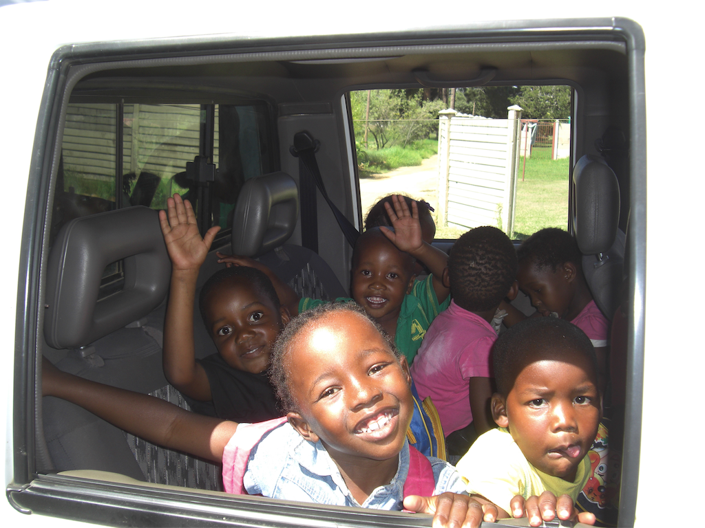 How many in the car? You can try to count, but there are so many bodies crammed in there! The answer is 31 children … plus 3 adults, one of whom, as you can see, was Marion.